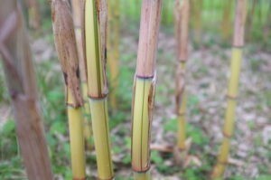 Malgré qu’il soit originaire du comté d’Anji dans la province chinoise du Zhejiang, Phyllostachys aureosulcata ‘aureocaulis’ est nommé Huang gan jing zhu en chinois , ce qui signifie : Bambou à tiges jaunes de Pékin.
